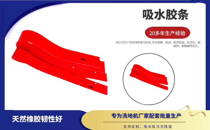產品說明:吸水膠條是洗地機吸水扒上的重要部件,作用就是與地面接觸,產生一個密封的空間,把地面上的污水通過風機進行回收。吸水膠條一般分為耐油型(進口PU原料)和普通型(進口NR原料)兩種。