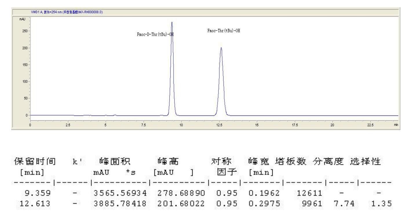 方法說明:使用 Chiral MZ(2)-RH 5u 250*4.6mm 色譜柱,簡單流動(dòng)相條件下成功實(shí)現(xiàn)了 Fmoc-Thr(tBu)-OH手性拆分。分離度大,柱效良好且峰形優(yōu)秀。