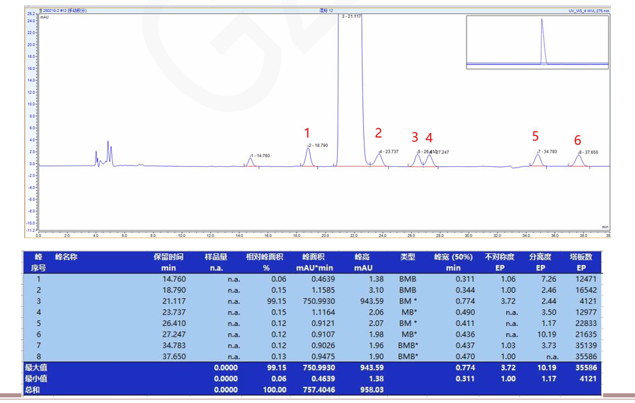 App ID: FLM-B250005 維生素K1 及其異構體的手性拆分 色譜柱:Chiral NQ(2)-RH 3μm 250*4.6mm (貨號:FMG-AC3-A06-R) 流動相:咨詢 流速:0.8 mL/min 檢測波長:275nm 柱溫:25℃ 樣品濃度:N/A 稀釋劑:N/A 進樣量:20ul 色譜圖:
