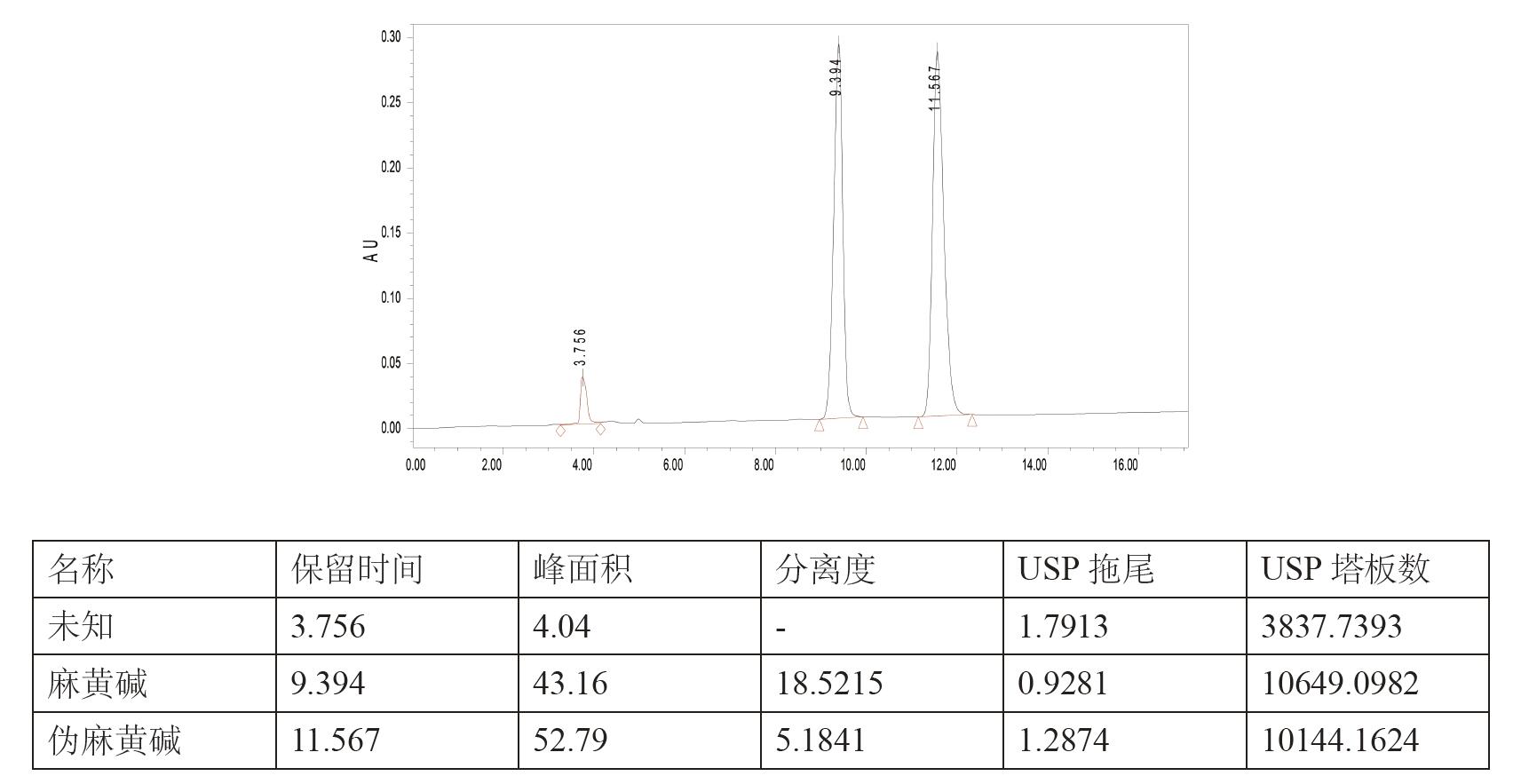 參照 2015 版中國藥典麻黃檢測色譜條件:以極性乙醚連接苯基鍵合硅膠為填充劑;以甲醇-0.092% 磷酸溶液(含0.04% 三乙胺和 0.02% 二正丁胺)(1.5: 98.5)為流動相;檢測波長 210 nm;理論塔板數(shù)按鹽酸麻黃堿峰計(jì)算應(yīng)不低于3000。